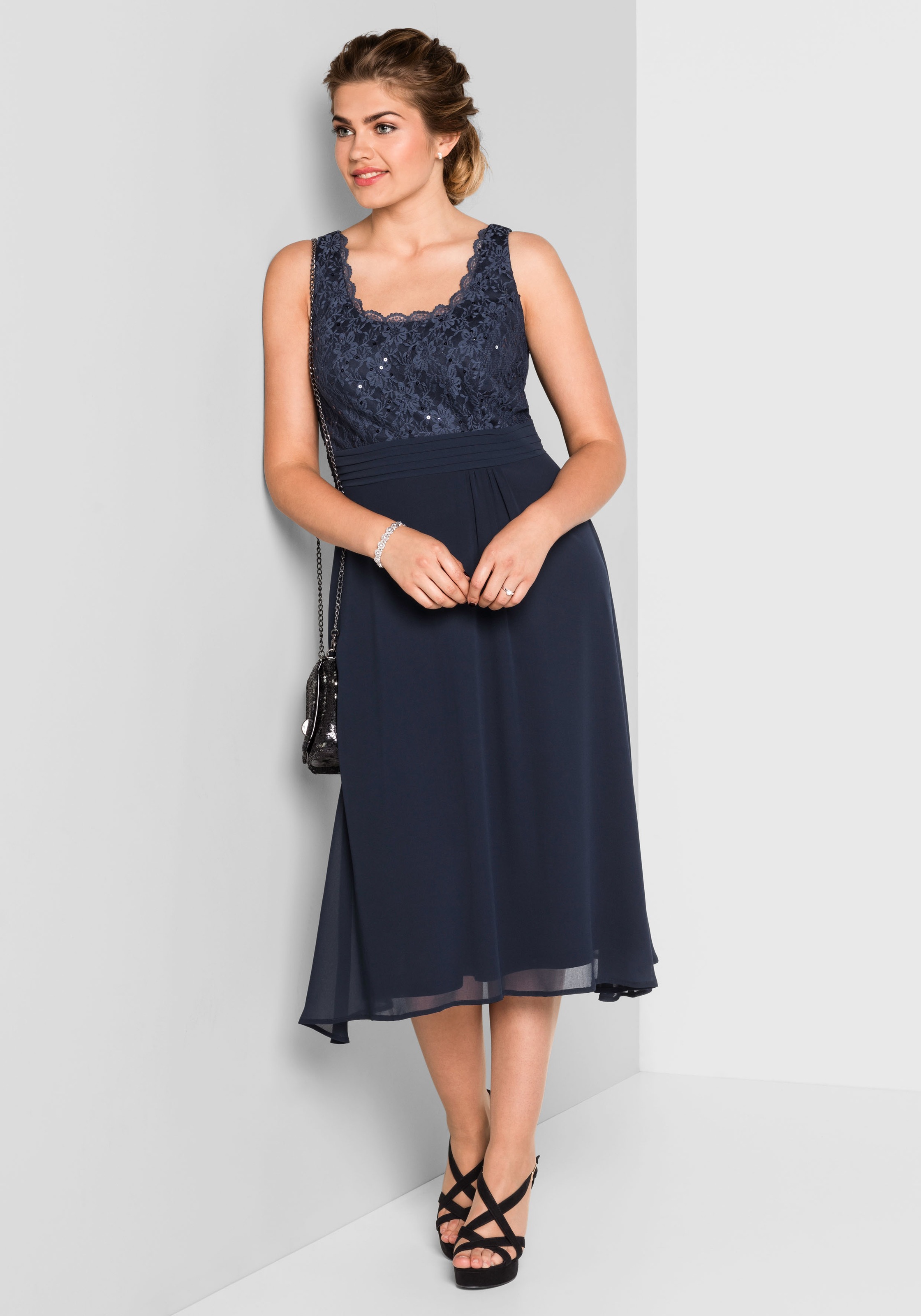 Sheego Abend Kleid Modisches Damen Ausgeh Kleid Mit Spitzen Oberteil Grosse Grossen Schwarz